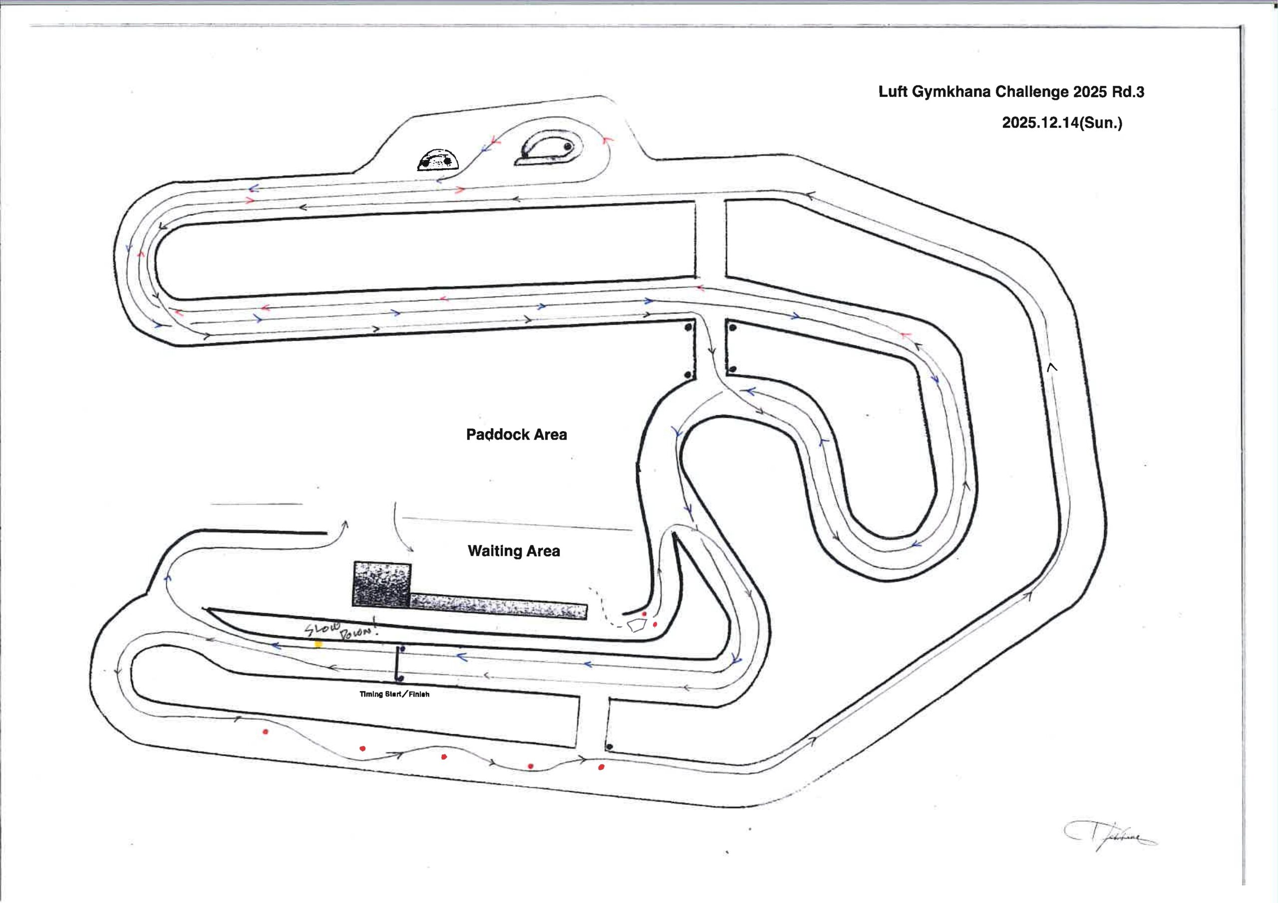 終日不安定な天候・路面状況の中、多くの方にご参加いただきありがとうございました。2025年最終戦は、モーターランドの特徴を使ったハイスピードなコースとしました。私の中では、『モーターランド鈴鹿の行うジムカーナ競技会の原点復帰』でした。ジムカーナ走行ってコースを覚えられない・サイドターンができないと参加も…という方々にも競技会を体験し楽しんで頂くという想いです。
